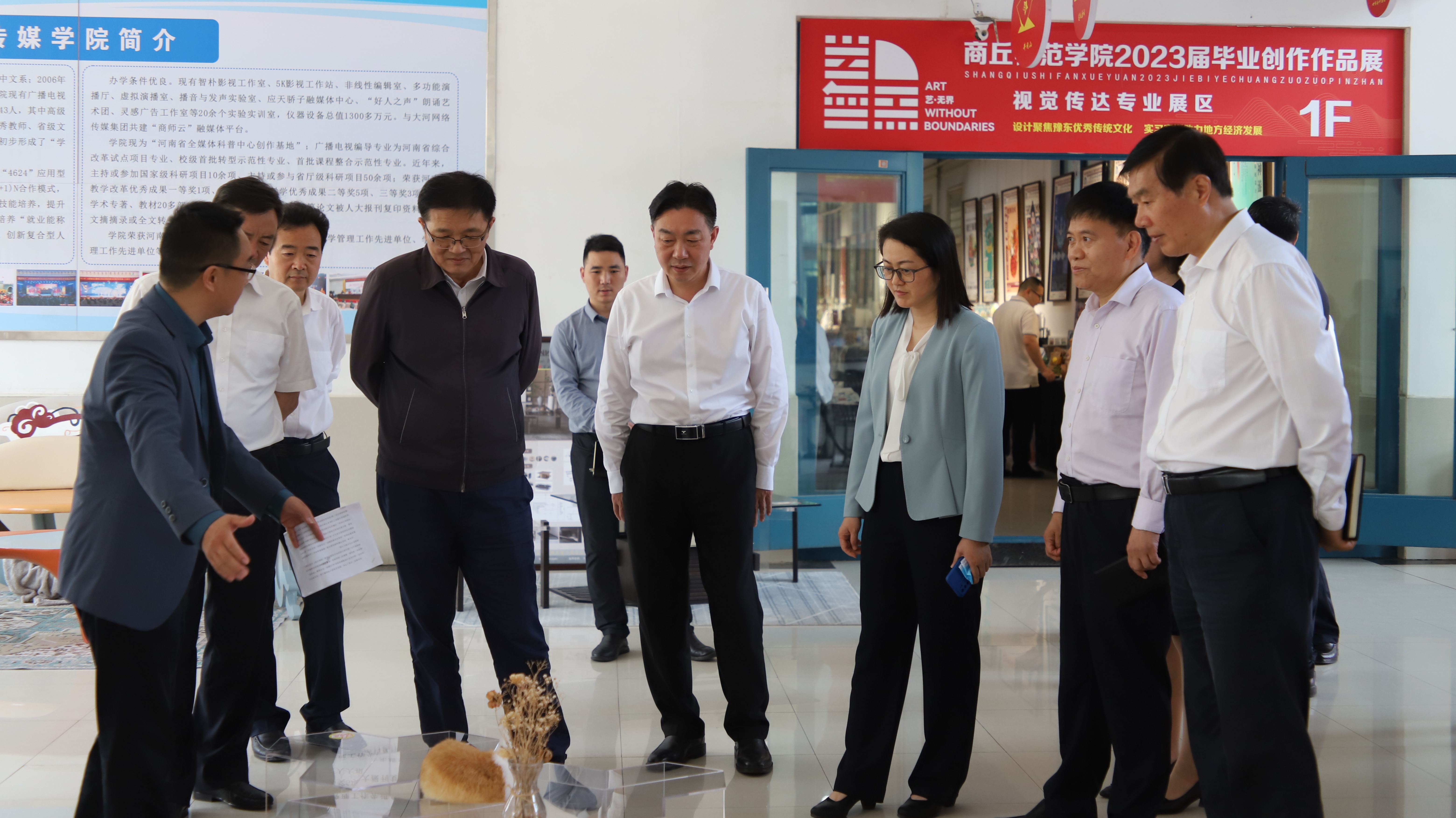 省委巡回指导组一行深入马克思主义学院,围绕思政课程、课程思政和思政工作等方面与马克思主义学院班子成员、部分思政课教师代表、学生代表等进行了探讨交流。韩斌询问了《习近平新时代中国特色社会主义思想概论》课程的开设情况,并对进一步开好上好《习近平新时代中国特色社会主义思想概论》课提出了指导意见。省委巡回指导组先后深入教务处、后勤服务中心调研指导,到教室、餐厅与学生面对面交流,详细了解学生学习、生活情况。接着,参观了艺术设计学院、国际教育学院主办的2023届“艺——无界”毕业创作作品展。随后召开必赢bwin线路检测中心主题教育座谈会。