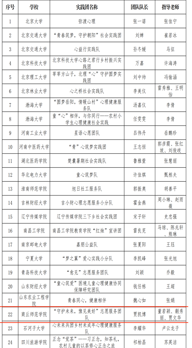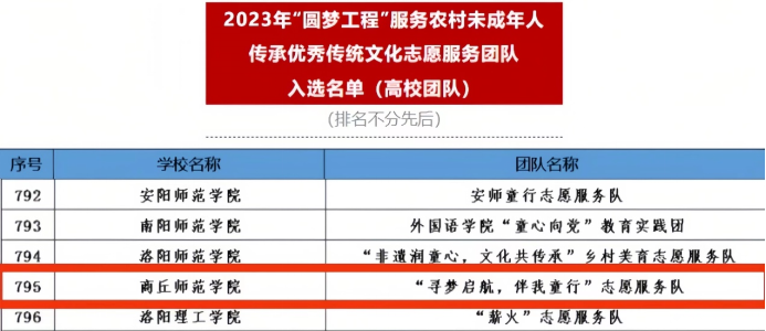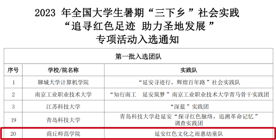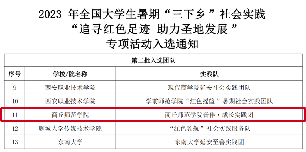 青春三下乡,奋斗正当时,随着社会实践活动,如火如荼的开展,必赢官网多个社会实践团队,接连传来喜讯。必赢官网青年志愿者协会和信息技术学院共同组建的“寻梦启航,伴我童行”志愿服务队入选2023年“圆梦工程”服务农村未成年人传承优秀传统文化志愿服务团队。音乐学院申报的“红色轻骑兵实践团”入选2023年“井冈情·中国梦”大学生暑期实践季专项活动。教师教育学院申报的“延安红色文化之雨惠幼童”实践团队入选第一批“追寻红色足迹 助力圣地发展”三下乡社会实践专项活动。音乐学院、法学院共建的“音伴·成长实践团”入选第二批“追寻红色足迹 助力圣地发展”三下乡社会实践专项活动。教师教育学院“守护未来,豫见美好”志愿服务团队入选2023年“圆梦工程”农村未成年人心理健康教育志愿服务项目大学生暑期心理健康社会实践活动。教师教育学院“童心同行”志愿服务团队入选2023年全国大中专学生“三下乡”社会实践活动之乡村振兴“笃行计划”专项活动全国性示范实践团队。