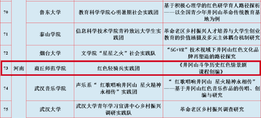 “红色轻骑兵实践团”主要围绕《井冈山斗争历史红色情景剧课程创编》开展课题探讨研究,是河南省唯一一支入选“井冈情·中国梦”大学生暑期实践季专项活动的团队,也是必赢官网首次入选团中央井冈山社会实践专项活动。