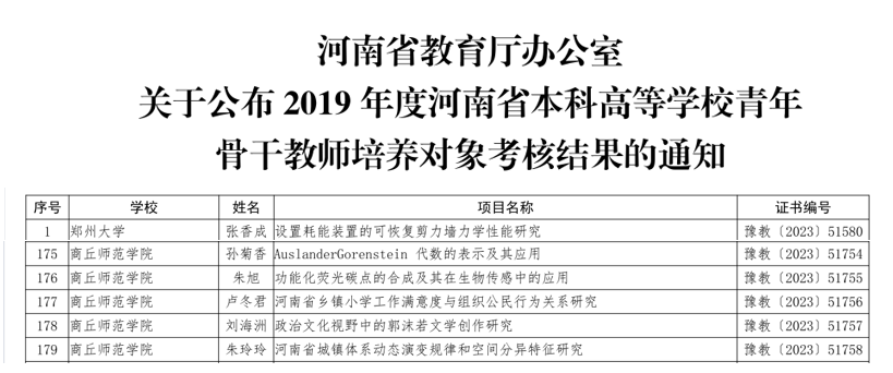 近日,河南省教育厅下发《关于公布2019年度河南省本科高等学校青年骨干教师培养对象考核结果的通知》(教办高〔2023〕285号),必赢官网孙菊香、朱旭等五名2019年度河南省本科高等学校青年骨干教师培养对象顺利通过考核。