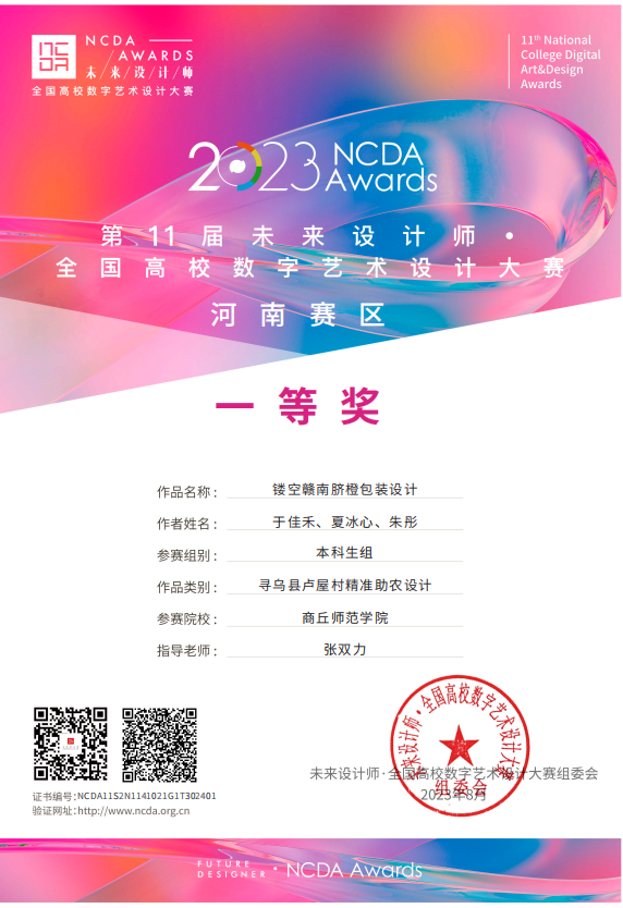 近日,2023第11届未来设计师全国高校数字艺术设计大赛(NCDA)河南赛区发布获奖通知,必赢官网艺术设计学院共有十余项作品获奖,其中学生一等奖1项、二等奖4项、三等奖6项,20级视觉传达专业学生于佳禾、夏冰心、朱彤三位同学的包装设计作品“镂空赣南脐橙包装设计”在本次大赛中荣获一等奖。