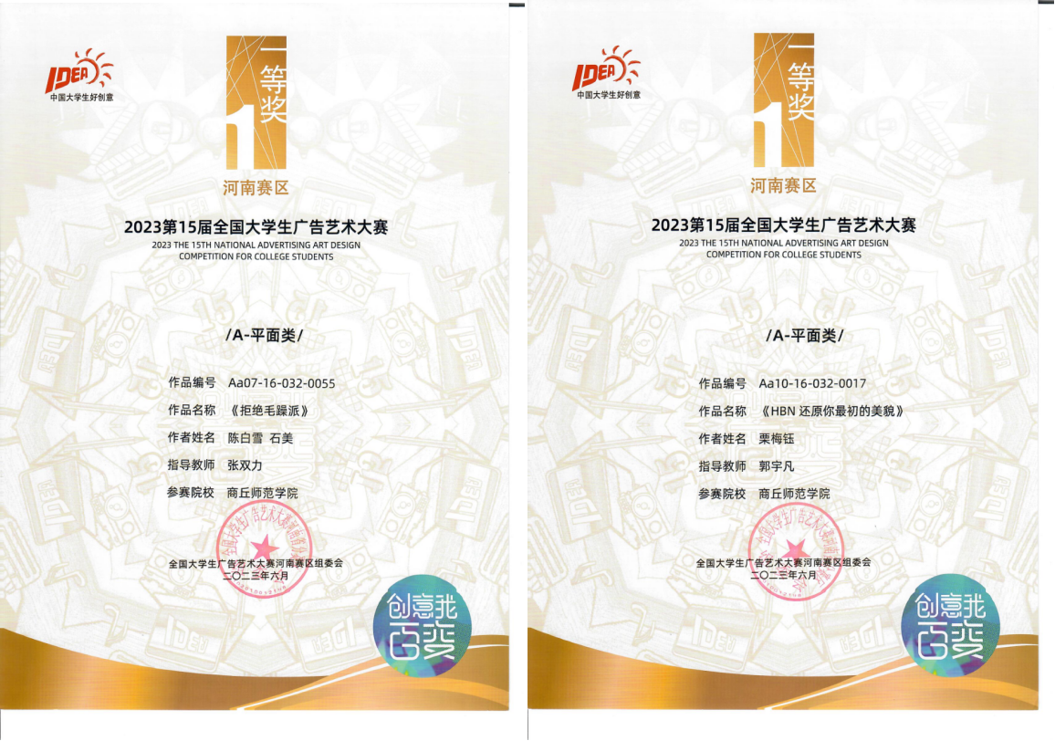 近日,第十五届全国大学生广告艺术大赛(简称“大广赛”)河南赛区获奖名单公布,我院同学获得一等奖2项、二等奖11项、三等奖7项、共计20个奖项。