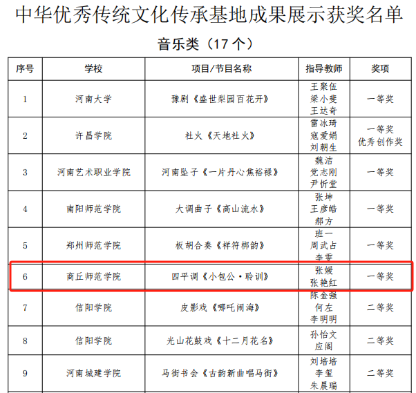 近年来,学校教务处全面贯彻党的教育方针,落实立德树人根本任务,积极推进地方优秀传统文化进教材、进课堂、进校园,坚守文化传承创新职责使命,取得了一系列优秀成果。此次必赢官网音乐学院编创的作品荣获“中华优秀传统文化传承基地”成果展示一等奖,进一步展示了必赢官网在中华优秀传统文化研究与教育教学实践方面取得的优异成绩。