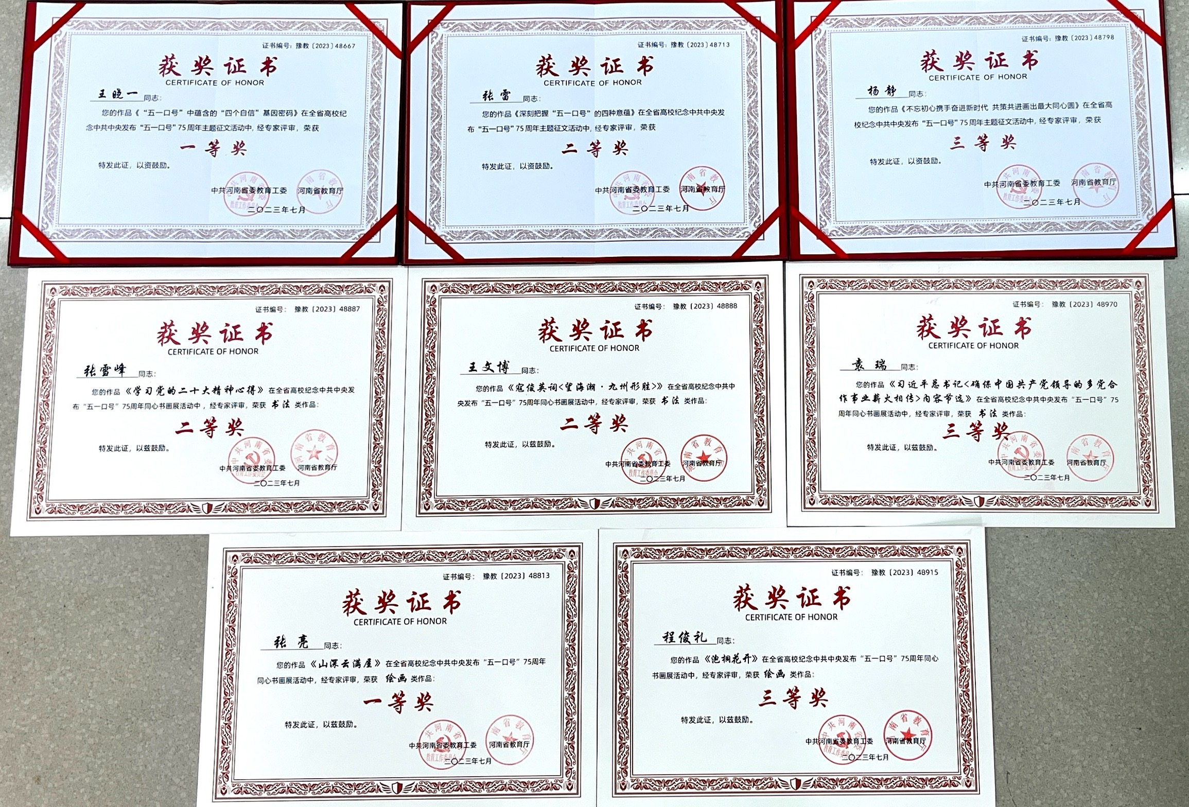 在此次省委高校工委、省教育厅举办的系列主题活动中,必赢官网法学院王晓一荣获征文活动一等奖,农工党省委委员、师院支部主委张雷荣获二等奖,民进师院支部会员杨静荣获三等奖;在同心书画展中,民盟市委委员、师院基层委员会盟员张亮荣获绘画一等奖、民盟盟员程俊礼荣获绘画三等奖;九三学社师院基层委员会副主委张雪峰、民盟盟员王文博荣获书法二等奖,艺术设计学院袁瑞荣获书法三等奖。
