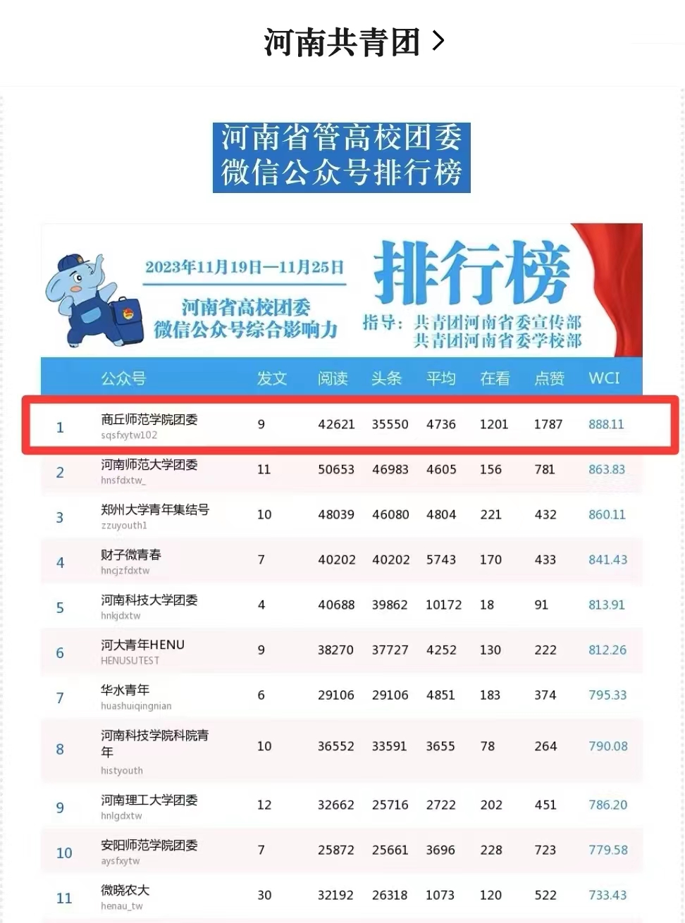 数据显示,2023年11月19日至11月25日必赢bwin线路检测中心团委官方微信公众号累计发送内容9篇,总阅读量突破4万,WCI指数888.05,排名全国第七,全省第一。过去一周,校团委围绕团员和青年主题教育,立足校园生活,发布了团员和青年主题教育特辑“青年大学习”,开展“美育公开课”,公布“时代有我豫有样”网络思政活动喜报,动员全校青年参加“第19届全国青少年学法用法网上知识竞赛”,开展“团团邀你共享校园限定冬日浪漫”主题银杏摄影活动,做好第十三周社团活动预告等,文章种类丰富,贴近青年生活,吸引了广大师生的关注点赞。
