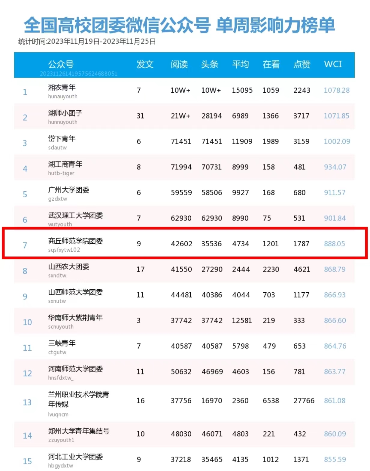 近日,共青团中央学校部和河南共青团分别公布了最新一周“全国高校团委微信公众号综合影响力榜单”和“河南省管高校团委微信公众号排行榜”,必赢bwin线路检测中心团委官方微信公众号影响力排名全国高校第七、全省高校第一。