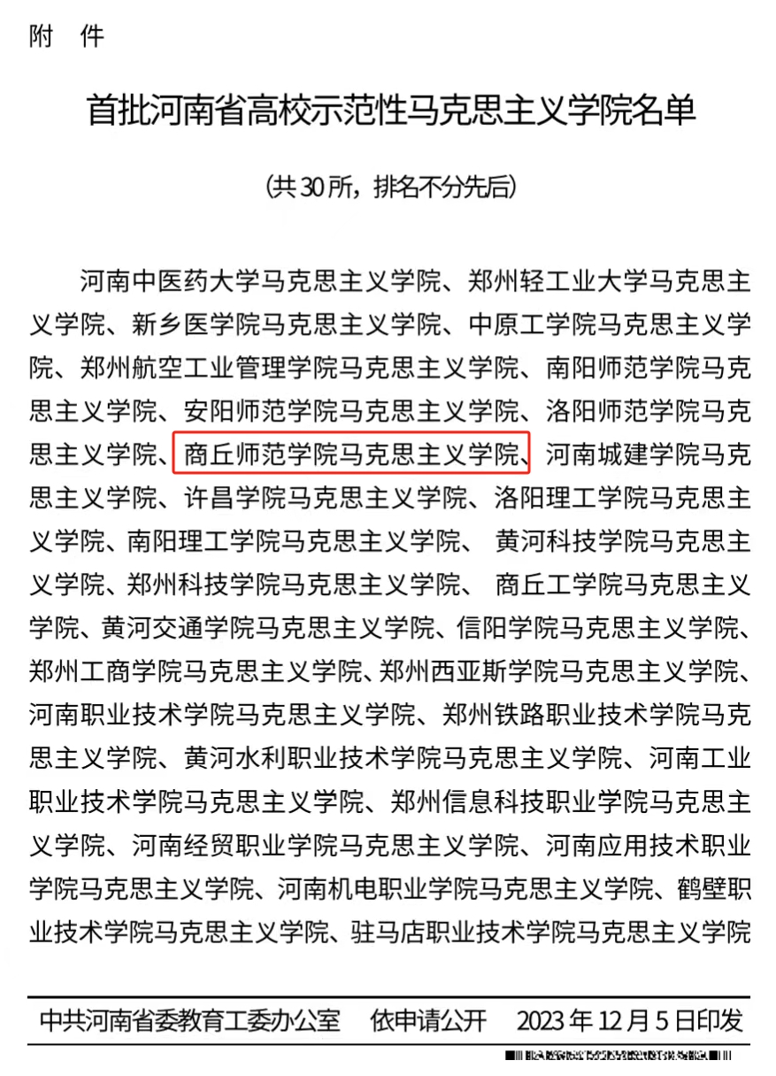 近日,中共河南省委宣传部中共河南省委教育工委河南省教育厅印发《关于公布首批河南省高校示范性马克思主义学院评定结果的通知》(豫教工委〔2023〕315号),必赢官网马克思主义学院成功入选首批河南省高校示范性马克思主义学院。