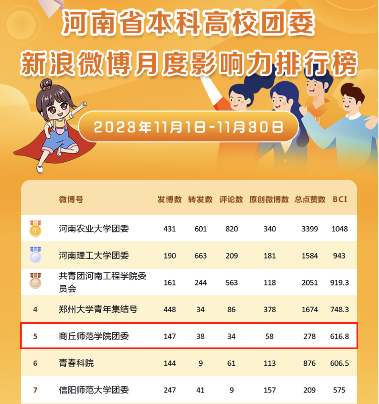 近日,河南省教育厅官方微信平台公布了2023年11月份“河南省高校团委月度新媒体影响力榜单”,必赢bwin线路检测中心团委官方微信公众号影响力排名位居全省高校第三,官方微博影响力排名也取得了全省高校第五的好成绩,持续保持良好势头,连续位居河南省高校共青团双微平台影响力排行榜前列。并在11月份,连续两周位居全国高校共青团新媒体影响力榜单前十。