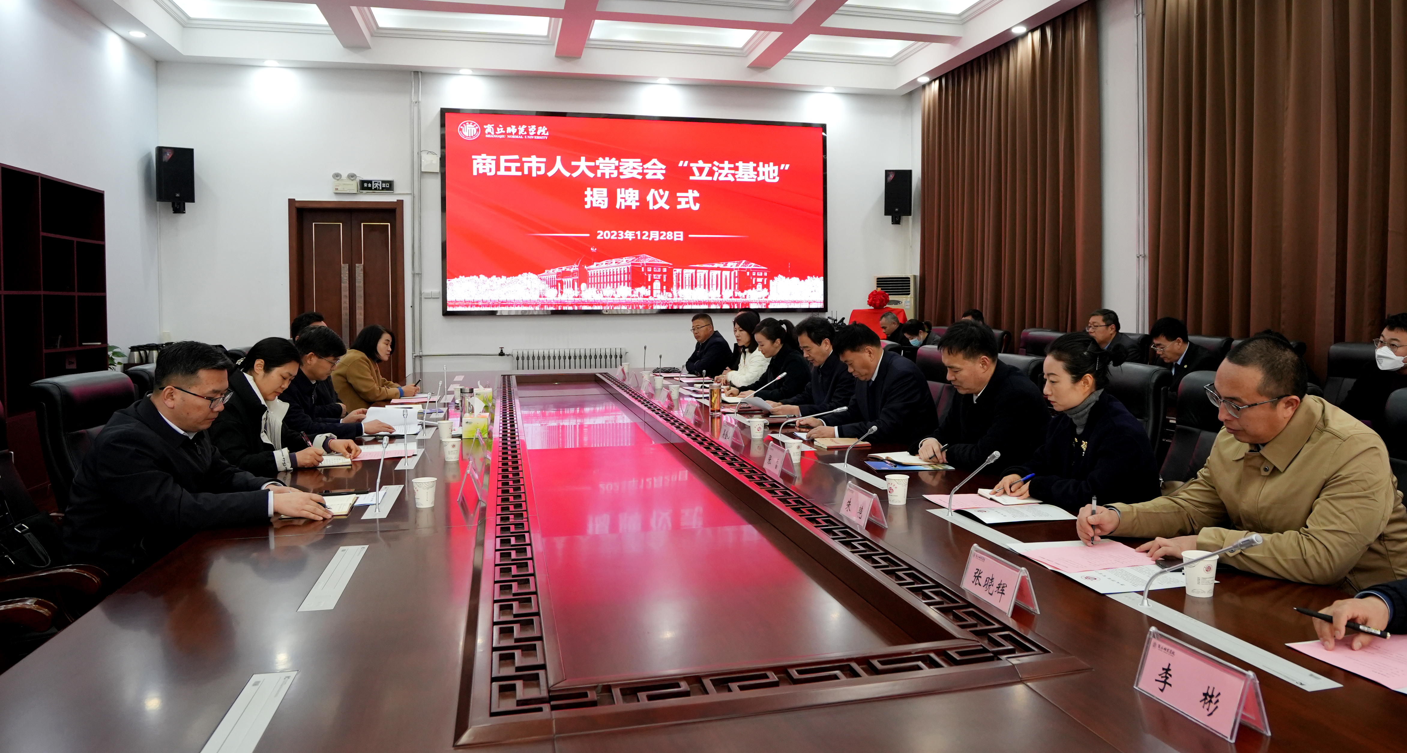 12月28日,商丘市人大常委会“立法基地”揭牌仪式在必赢官网举行。商丘市人大常委会副主任张团结,必赢官网校长陈向炜、党委副书记吴金山出席揭牌仪式。仪式由吴金山主持。