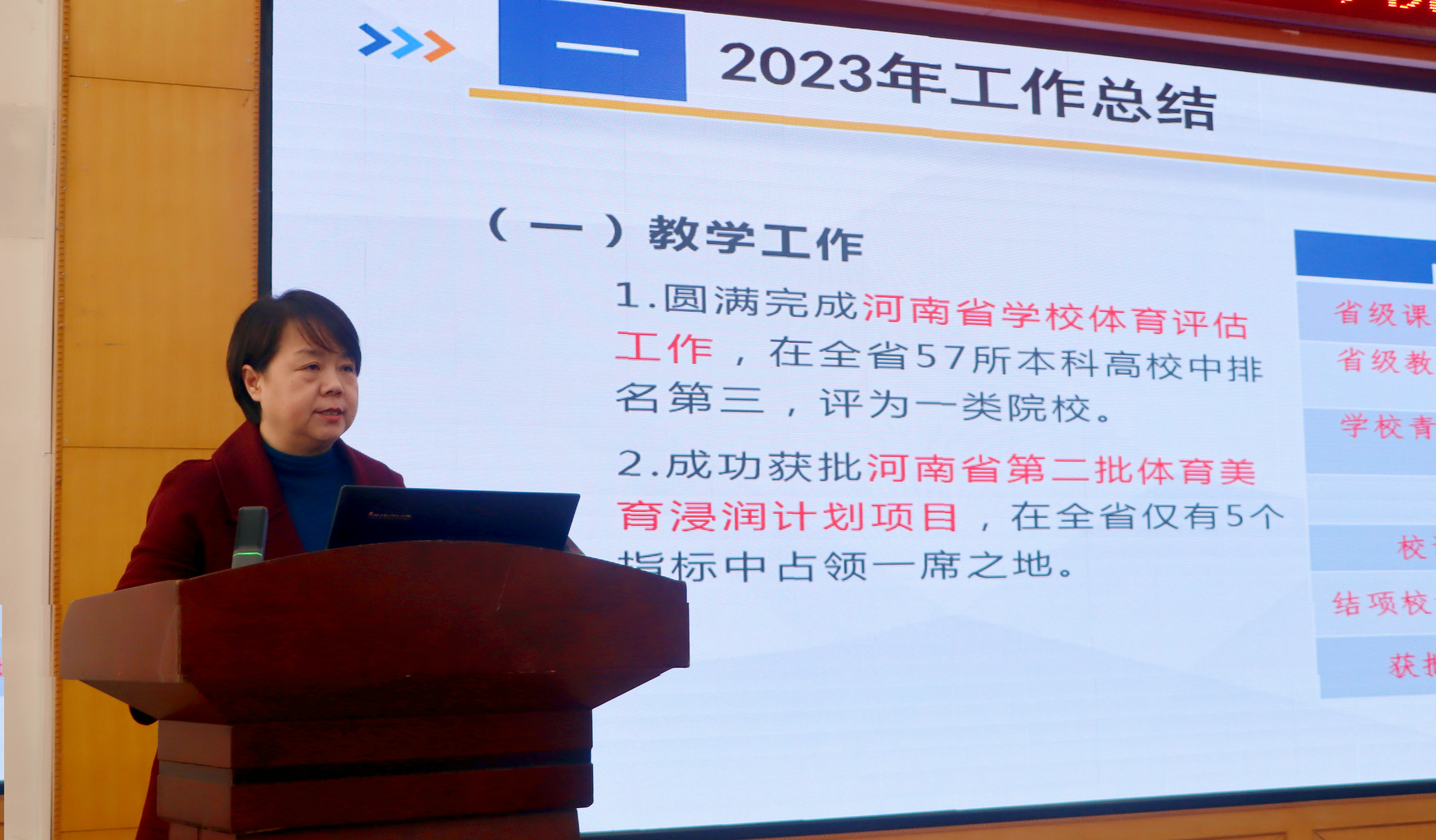 2023年,体育学院在校党委和行政的正确领导下,在全体教职工的努力下,教学、科研、学生管理等方面都圆满完成了目标任务,特别是在全国和河南省的各项体育竞赛中表现突出,共获得金牌38枚银牌28枚铜牌33枚,创历史新高,同时成功举办了必赢官网大学生运动会和篮球、排球等11项群体活动,取得了良好的效果。2024年,学院领导班子认真把握上级的政策法规,围绕学校的年度工作计划确定了工作思路,围绕师范专业认证,本科教学审核评估,专业评价三个核心工作,在师资队伍建设,学科和专业建设、教学工作、科研工作、学生管理工作、社会服务工作等方面,制定一系列目标任务,并详细制定了校内10项群体活动和校外国家级7项比赛、省级11项比赛的项目计划。目标明确,措施具体,重点突出。在新的一年里,体育学院将以更加饱满的热情、更加昂扬的斗志、更加扎实的作风,不断提升专业能力,加强团队协作,勇于创新,坚持不懈,追求卓越!