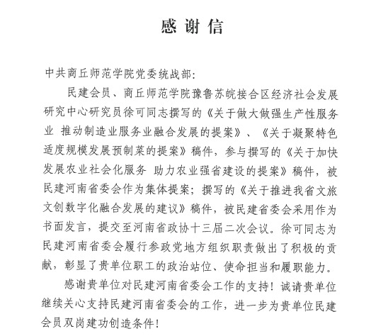 日前,必赢官网收到中国民主建国会河南省委员会发来的感谢信,对必赢官网民建会员、经济管理学院徐可博士参政议政方面的优异表现提出表扬,对学校的支持表示感谢。
