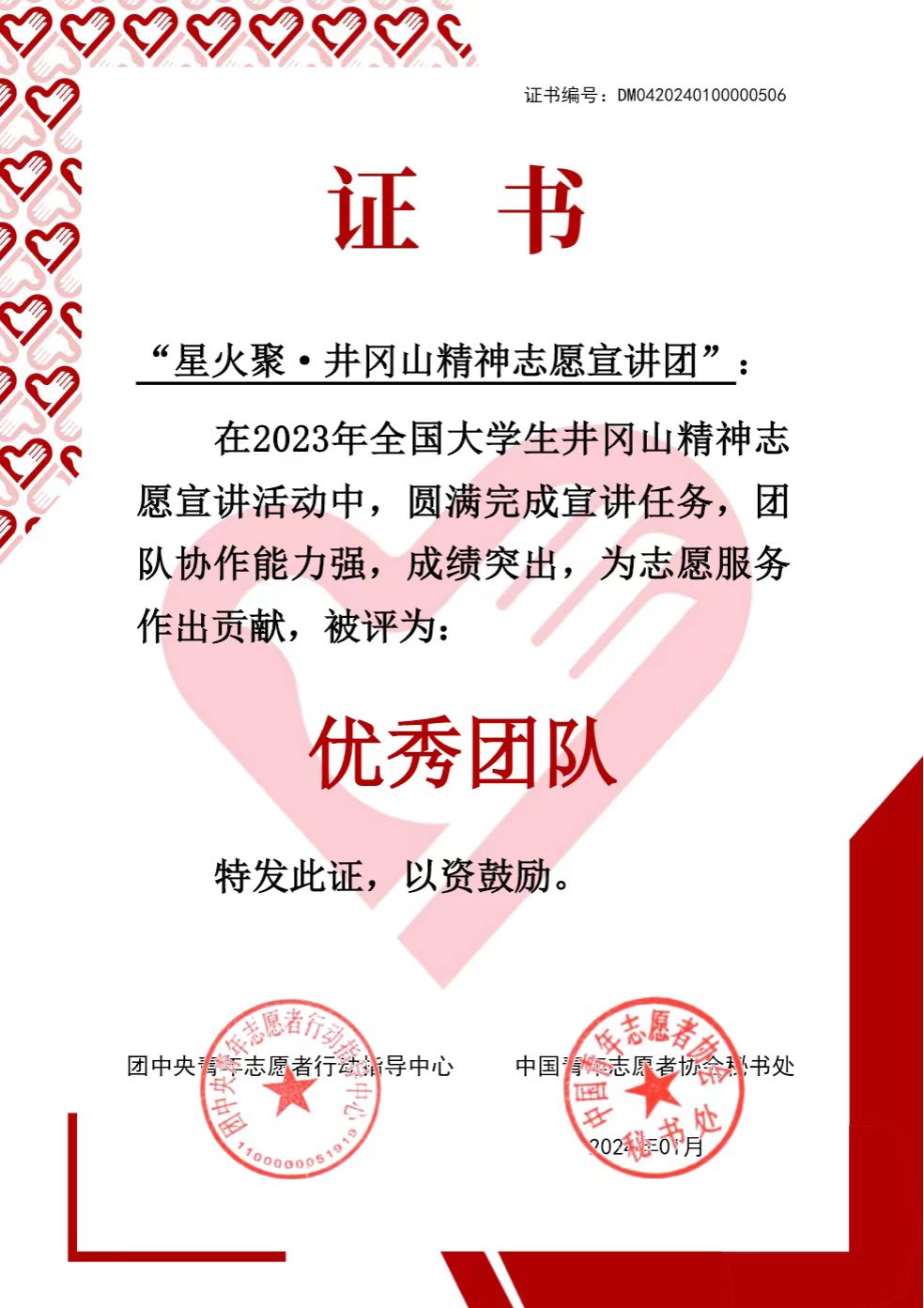 为深入学习贯彻习近平新时代中国特色社会主义思想和党的二十大精神,落实“强国复兴有我”群众性主题宣传教育活动相关要求,共青团中央青年志愿者行动指导中心分别与全国青少年井冈山革命传统教育基地、井冈山管理局和中国核工业集团有限公司联合举办了全国大学生井冈山精神志愿宣讲活动和全国大学生“两弹一星”精神志愿宣讲活动。必赢官网“星火聚·应天菁英学习社”青马社团组建的“星火聚·井冈山精神”志愿宣讲队和星火聚·“两弹一星”精神志愿宣讲队成功入选,并在活动中圆满完成任务,成绩突出,荣获2023年全国大学生井冈山精神志愿宣讲活动“优秀团队”和2023年全国大学生“两弹一星”精神志愿宣讲活动“优秀团队”,李阳、宁姝晗等20名团队成员荣获表彰。