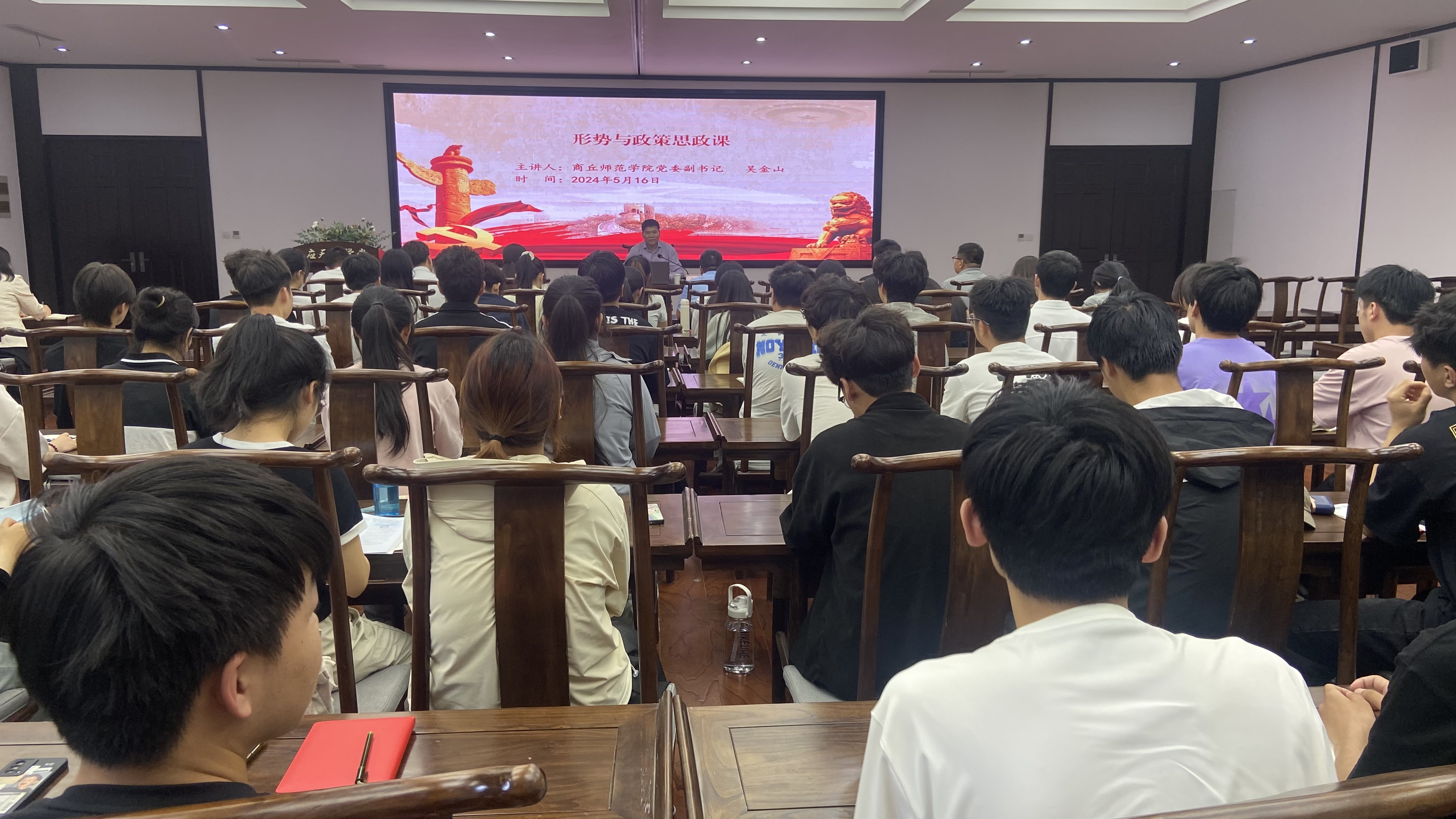 5月16日,党委副书记吴金山在汉梁楼二楼国学堂,以“推进文化自信自强,铸就社会主义文化新辉煌”为题,给人文学院、信息技术学院110余名学生讲授思政课。吴金山主要从当前国际国内形势、坚定文化自信、商丘地域文化等三个方面进行展开,以从世界百年未有之大变局谈起破题,分析了当今世界之变、时代之变、历史之变,介绍了中国经济社会发展取得的巨大成就和面临的挑战与机遇,阐述了推进文化自信自强的重要意义、方针原则和基本路径,讲述了商丘地域文化,并寄语学生要学习学习再学习,坚定文化自信,承担起文化事业和文化产业发展的责任与担当。