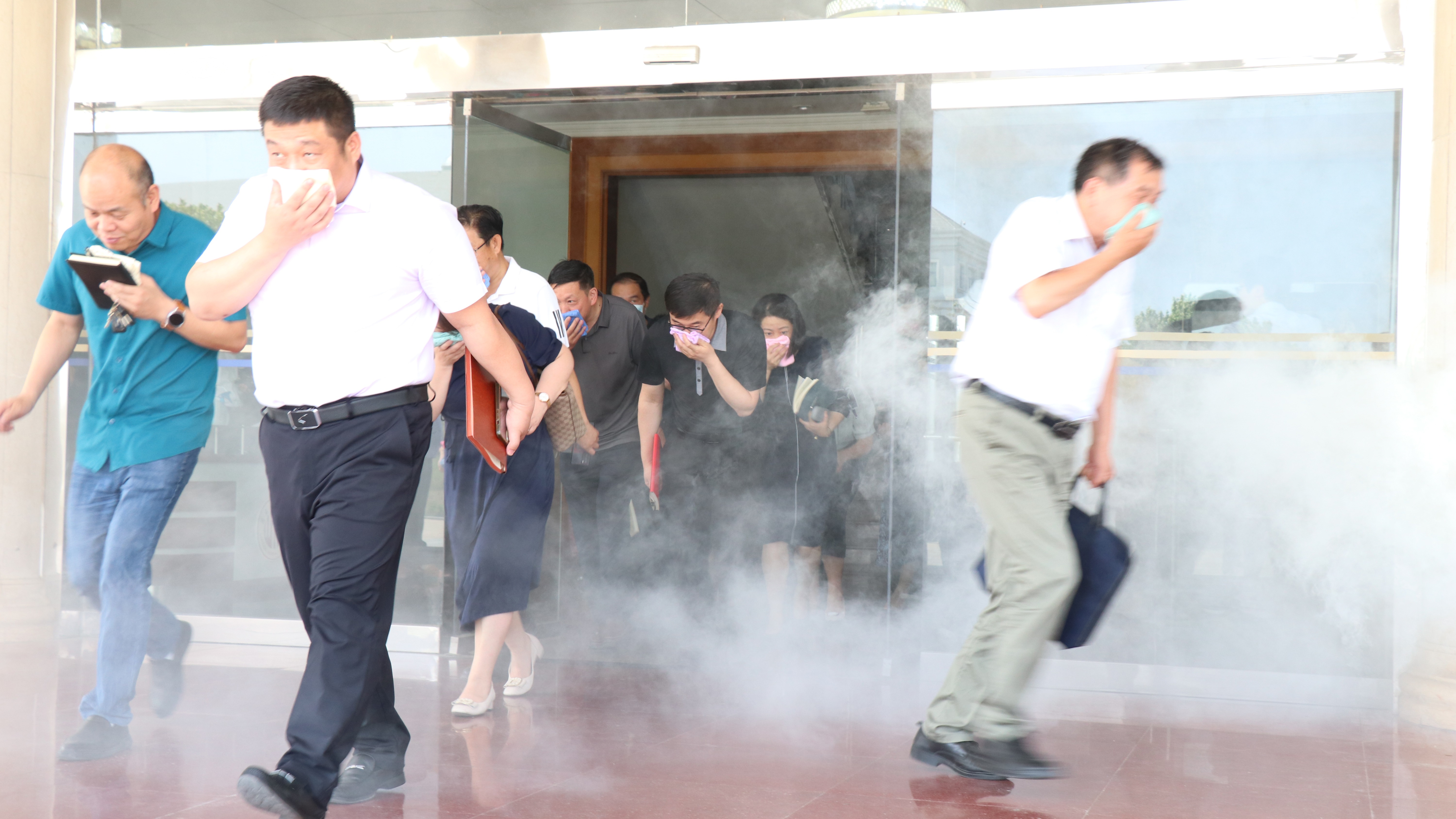 宣讲结束后,随着警报系统启动,应急疏散演练正式开始,参加演练人员按照逃生要领,有序从消防通道撤离到安全地带。