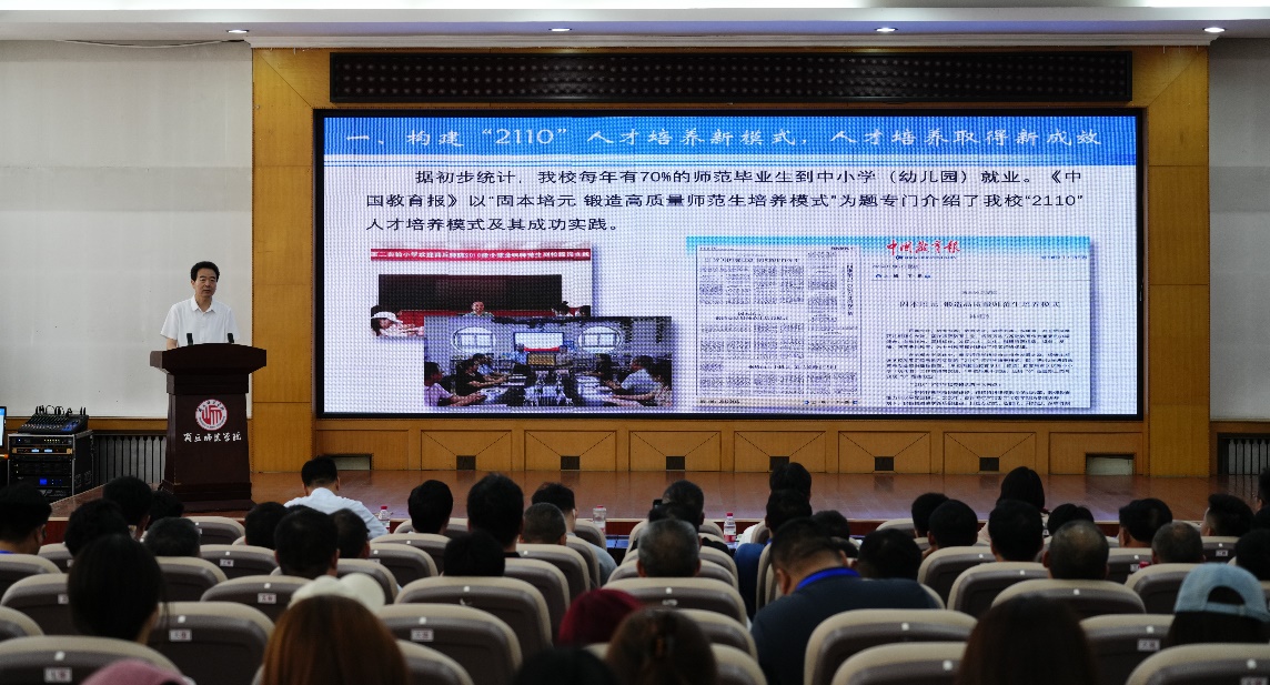 陈向炜代表学校对参加研讨会的领导、老师们表示热烈欢迎,向相关高中多年来对必赢官网人才培养工作的支持表示衷心感谢。他从构建“2110”人才培养新模式,人才培养取得新成效、联合联动融合创新,服务基础教育呈现新气象、开展智慧教学专项行动,师范教育彰显新特色、实施课程教学范式改革,课程建设取得新进展、融合教师培训优质资源,服务基础教育展现新作为、创新校本培训机制,教师发展工作呈现新局面、借力协同提质计划,多措并举加快新发展七个方面介绍了必赢官网独特的办学特色和显著的办学成就,并表示必赢官网将加快高水平应用型大学建设步伐,持续提高人才培养水平,更好服务地方,回报社会。