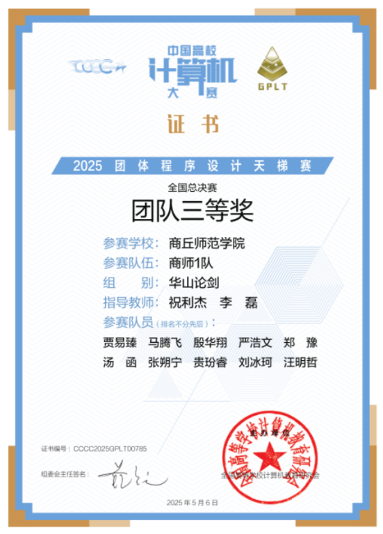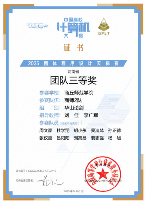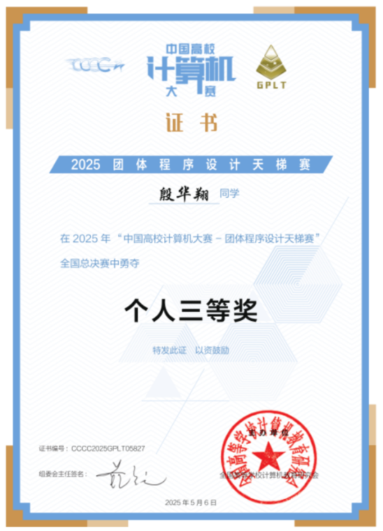 近日,2025年大学生团体程序设计天梯赛圆满落幕,必赢bwin线路检测中心信息技术学院代表队凭借卓越实力脱颖而出,斩获多项殊荣,创造了学院在该项赛事中的最佳成绩。商师一队荣获国家级团队三等奖以及省级团队二等奖,商师二队荣获省级团队三等奖。个人奖项方面,贾易臻同学发挥出色,荣获国家级个人二等奖;马腾飞、殷华翔、严浩文三名同学荣获国家级个人三等奖。