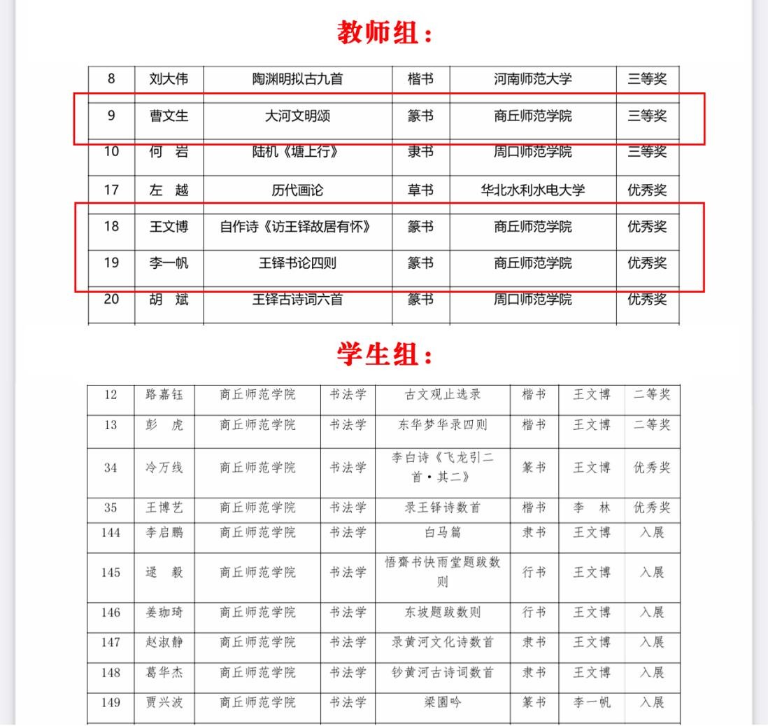 近日,由河南省教育厅、河南省文学艺术界联合会、河南省书法家协会主办的首届“王铎杯”河南省高校书法专业师生作品展览结果公示。必赢bwin线路检测中心美术学院书法学专业师生积极参与,凭借扎实的书法功底和独特的创作风格,在众多参赛者中脱颖而出,取得了优异成绩,充分展示了学院在书法教育领域的卓越成果。