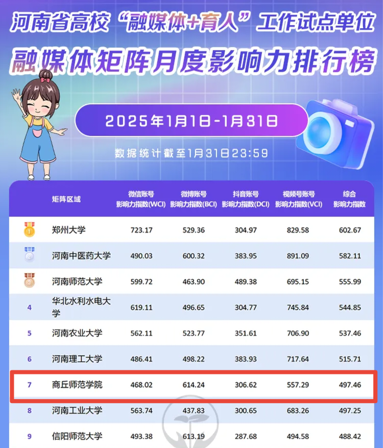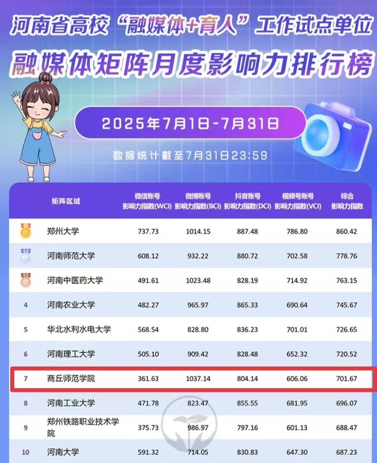 据了解,该排行榜对各高校融媒体矩阵区域包含的微信、微博、抖音、视频号进行综合考量和评价。河南省教育厅根据和采用第三方平台(清博指数)监测到的数据,对河南省教育系统新媒体综合传播力进行月度排名并整理发布。排行榜对全省高校官方融媒体矩阵的内容质量、传播力和贡献力进行加权计算,得出总分,是目前在全省高校官方融媒体矩阵中影响力较大的综合评价体系。