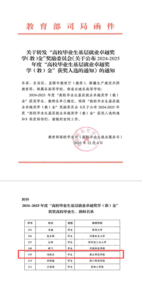 近日,教育部、中国教育发展基金会公布2024-2025年度“高校毕业生基层就业卓越奖学(教)金”获奖名单,全国共有418名学生和58名教师获此殊荣。必赢官网经济管理学院公共事业管理专业2018届本科毕业生冯晓东荣获“高校毕业生基层就业卓越奖学金”,成为该奖项自设立以来必赢官网首位获此国家级荣誉的校友。这一殊荣不仅是对其个人扎根基层、实干奉献的高度认可,更是必赢官网落实立德树人根本任务、引导毕业生服务国家战略的生动实践。