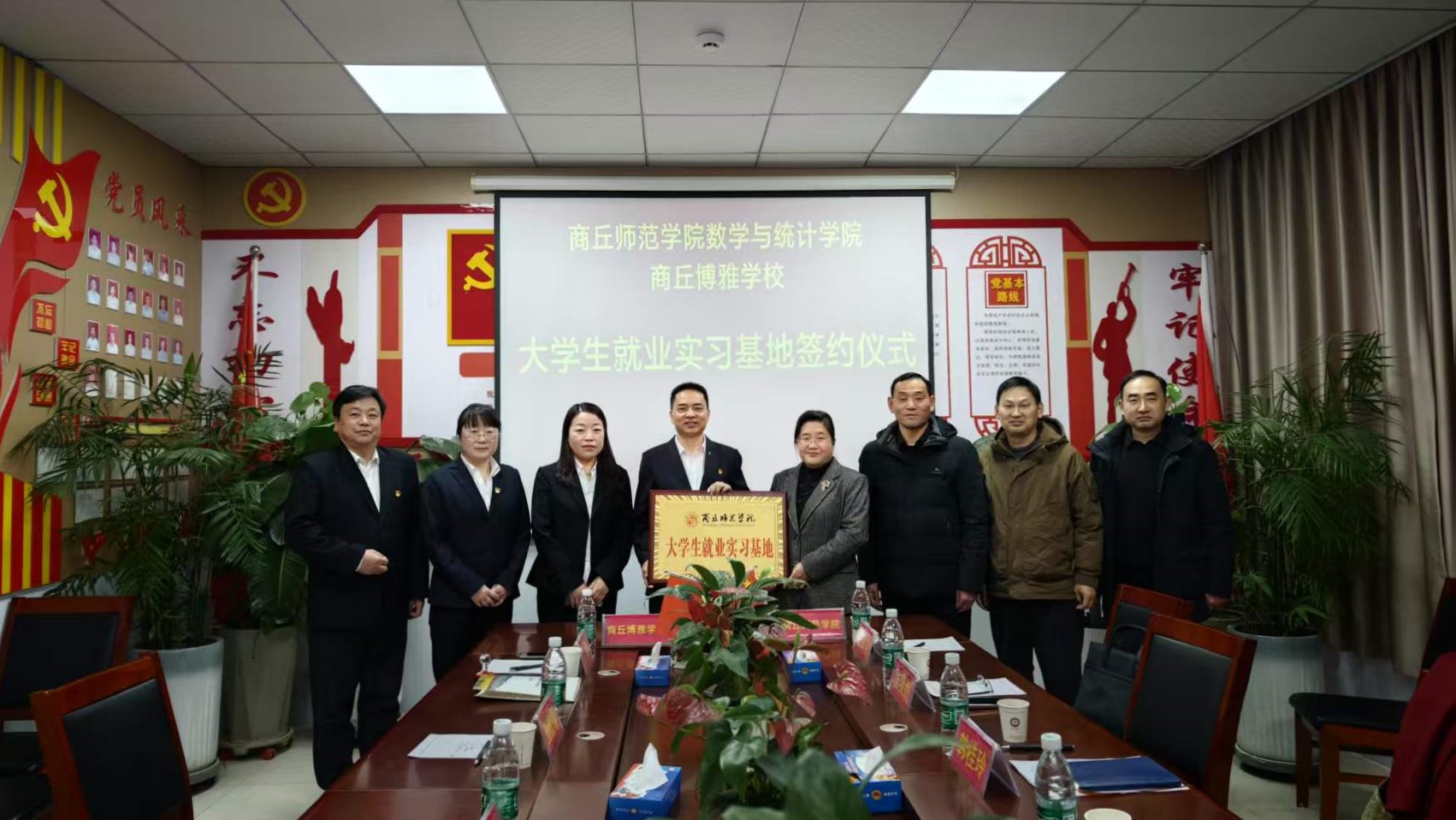 1月29日,副校长韩桂玲带领数学与统计学院领导班子前往商丘市博雅学校,开展“访企拓岗促就业”专项对接活动。韩桂玲介绍了学校在师范教育、学科建设与人才培养方面的特色与成效,她指出,学校将始终扎根豫东、服务地方,不断探索师范生培养新模式,实现高校与中小学的资源共享与育人协同。双方共同签署了《必赢bwin线路检测中心大学生就业实习基地协议书》,并举行“大学生就业实习基地”授牌仪式。