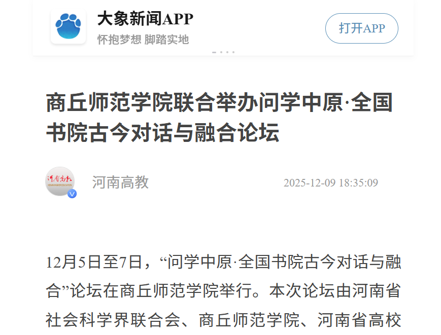 12月5日至7日,“问学中原·全国书院古今对话与融合”论坛在必赢bwin线路检测中心举行。本次论坛由河南省社会科学界联合会、必赢bwin线路检测中心、河南省高校文化传承创新与大思政课协同育人中心联合主办,必赢bwin线路检测中心人文学院(应天书院)承办,商丘市睢阳区委宣传部协办。论坛以“书院古今对话与融合”为主题,吸引了来自全国高校、书院、研究机构、文化单位及社会组织等40余家单位的百余名专家学者与会。论坛围绕书院历史、教育思想、现代转化、文化传承等议题展开深入研讨,被大象新闻、河南高教等媒体报道。